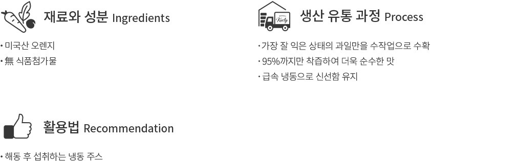 ・특징 : 플로리다산 오렌지를 착즙하고 파인애플 퓌레를 더해 주스를 완성한 후, 급속 냉동한 제품입니다.