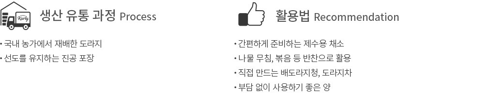 활용팁 ・도라지 무침 : 쓴맛을 제거한 도라지를 예열된 팬에 간장, 꿀을 넣고 볶아주세요. 중간 중간 물을 보충해주며 볶아주다가 마지막에 참기름, 깨소금을 뿌려 완성합니다.