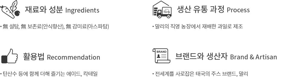 ・말리 주스는 시원한 상태로 즐겨야 그 맛이 가장 좋아요. 시원한 곳에 두고 마시거나, 탄산이 든 차가운 음료와 블랜딩 해 드셔보세요.