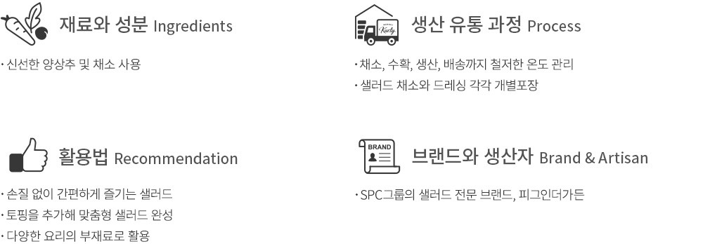 -이 제품은 알류(달걀, 메추리알), 잣, 우유, 메밀, 땅콩, 밀, 게, 새우, 돼지고기 복숭아, 토마토, 호두, 닭고기, 쇠고기, 오징어, 고등어, 아황산류, 조개류(굴, 전복, 홍합 포함)을 사용한 제품과 같은 제조시설에서 생산하였습니다. -대두 함유(드레싱)
