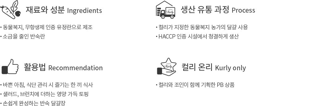 상품 수령 후 냉장보관 권장드립니다. 간혹 황화철 현상(흑변/녹변/청변)이 있을 수 있습니다. 달걀 흰자에 있는 황화수소와 노른자에 있는 철분이 열과 반응하여 일어날 수 있는 자연 현상으로 섭취에 이상이 없는 정상 범주이오니 구매에 참고 부탁드립니다.