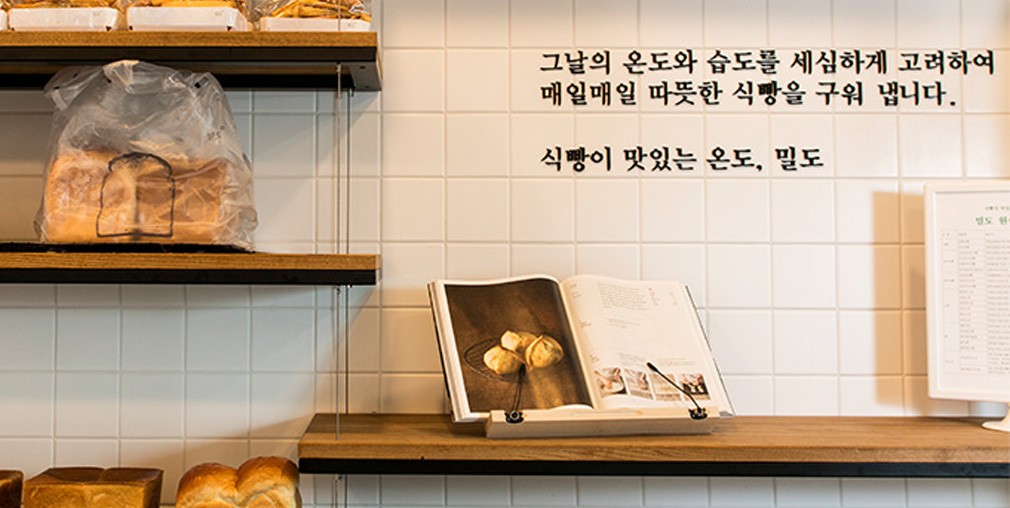 밀도는 식사빵의 기본 재료인 '밀'에 온도 습도의 '도'를 더한 의미예요. 밀도는 좋은 재료로 그날의 온도와 습도의 작은 차이까지 세심하게 고려해 기본에 충실한 식빵을 만들어내는 식빵 전문 베이커리랍니다. 시오코나의 수장이기도 했던 전익범 셰프는 '가장 기본이 되면서도 가장 어려운 빵 중에 하나인 식빵을 집중해서 만들어보자'라는 생각으로 '밀도'를 시작했지요. 기본과 원칙에 충실한 밀도의 모든 빵은 제대로 된 빵의 풍미를 선사하며 소박하지만, 단정한 품격이 느껴집니다. 화려한 꾸밈과 과장 없이 심플하게, 친근하고도 편안한 감성으로 다가가는 밀도는 일상에 따뜻한 위로와 기쁨을 선사하고 있답니다.
