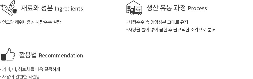 ・특징 : 인도양 레위니옹섬의 사탕수수를 이용해 만든 황설탕입니다. 틀에 넣고 굳힌 후 부수어 모양이 일정하지 않은 것이 특징이에요.
