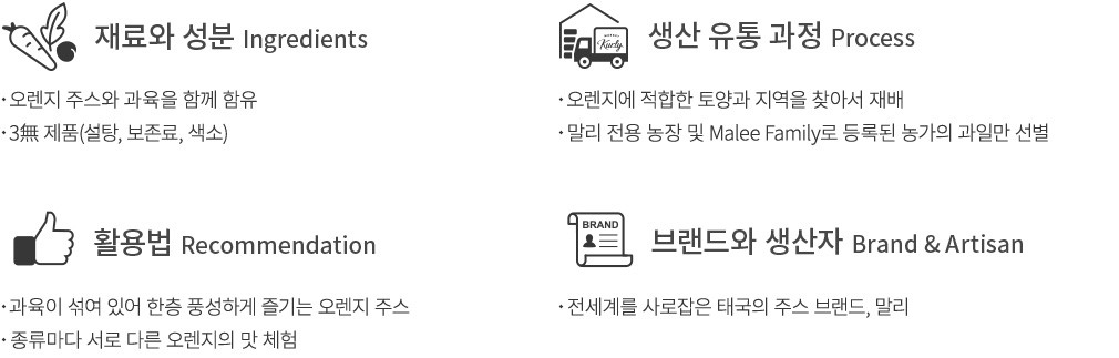 Malee는 태국에서 손꼽히는 규모의 과일 음료 회사랍니다. 동남아시아 지역 중에서도, 과일이 맛있기로 소문난 태국에서 Malee는 과일 수출상으로 처음 출발했죠. 많은 과일 농부들을 만나면서, 아주 크고 중요한 문제를 인식하게 됩니다. 바로 수요보다 많이 재배되어 남는 과일들이었죠. 분명 신선하고 맛도 좋은데, 과일의 재배는 공산품과 다르니 남은 과일은 모두 썩어 내버려지고 말았습니다. 그래서 말리는 계절에 관계없이, 과일의 영양과 맛을 그대로 신선하게 즐길 수 있는 방법을 고민했습니다. 그건 바로 '주스'였죠. 그렇게 선한 마음으로 만들기 시작한 과일 음료, 첨가제 없이 신선하고 건강하게 만들고 있습니다.