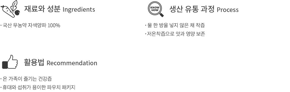 자색양파에는 안토시아닌과 파이토케미컬 등의 영양소가 풍부히 담겨있다고 해요. 진한 색을 띠는 채소나 과일에 주로 함유돼 있는 영양소지요. 일반 양파에 비해 달콤함이 더 짙게 감돌기에 양파즙에 처음 입문하는 분들께는 오히려 이 자색양파즙을 권하고 싶어요. 컬리는 물 한 방울 섞지 않고, 오직 무농약 자색양파만을 낮은 온도에서 착즙한 양파즙을 선보여요. 퀘세틴과 같은 영양분이 든 껍질까지 통째로 사용했답니다. 처음 드시는 분들도 맛보기용으로 부담 없이 섭취할 수 있는 10포와 선물용으로 알맞은 30포로 준비했으니 골라가세요.