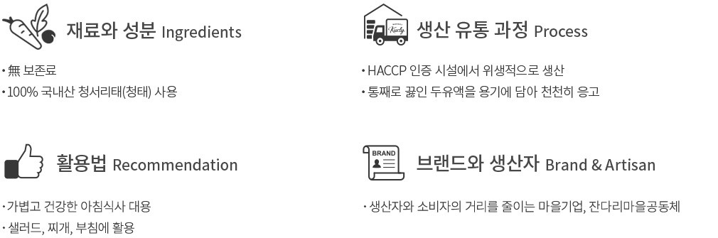 ・테이스팅 노트 : 일반 두부보다 밀도가 높고 부드러워요. 씹을수록 콩가루의 포슬포슬한 질감이 느껴지면서 단 맛이 올라옵니다.