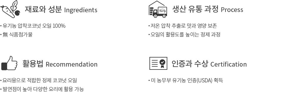 ・특징 : 유기농 코코넛을 저온 압착한 뒤 정제 과정을 거친 코코넛 오일이에요. 코코넛 특유의 풍미를 최소화한 제품으로, 열을 가하는 각종 요리에도 활용할 수 있습니다.