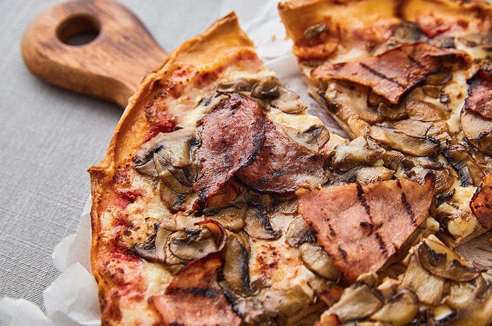 버섯과 햄을 듬뿍 올린 홈메이드 피자