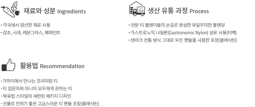・특징 : 안전한 가스트로노믹 나일론(Gastronomic Nylon) 섬유로 3g씩 포장한 티백 제품입니다. 맑고 시원한 첫맛과 함께 달달함을 즐길 수 있는 가향 블렌드 티 제품입니다.
