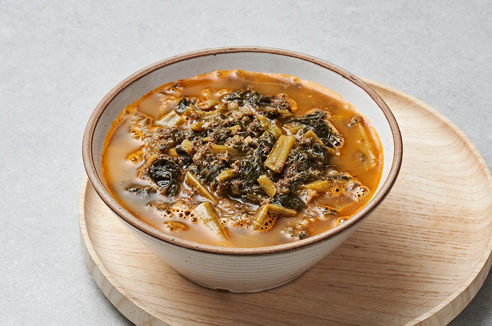 힘 좋은 미꾸라지를 갈아 넣고 푹 끓인 추어탕은 해마다 한 번쯤은 찾게 되는 보양식이지요. 매번 새로운 국, 탕 요리를 선보이는 올쿡이 이번엔 추어탕을 선보입니다. 국내산 미꾸라지를 푹 고아 뼈를 걸러내고 무청 시래기를 듬뿍 넣어 만들었어요. 된장과 고춧가루, 그리고 사골 분말을 넣어 얼큰하면서도 깊은 국물 맛을 자아냅니다. 들깨가루를 뿌려 특유의 잡내 대신 고소함을 즐길 수 있지요. 든든한 추어탕 한 그릇. 멀리 나가지 말고 집에서 간편하게 챙겨 드세요.