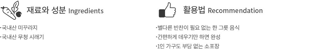 ・조리법 : 해동한 파우치의 내용물을 냄비에 옮겨 담은 뒤 중불에서 팔팔 끓여 드세요.