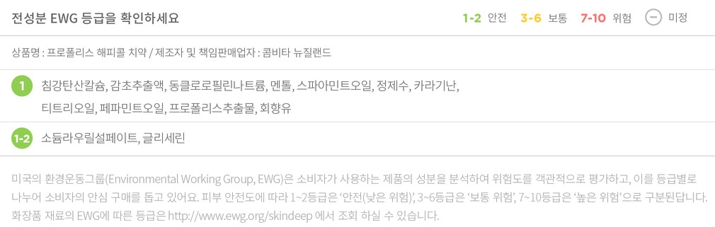 컬리는 EWG로부터 보통, 위험 등급을 받은 성분이라 하더라도 숨기지 않고 정직하게 공개합니다. 더불어 우려되는 성분에 대한 정보를 함께 제공해 드리오니 구입 전 반드시 확인해 주세요.