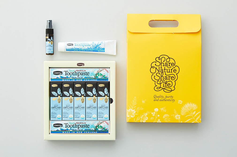 데일리 오랄 케어를 위한 선물세트를 소개할게요. 매일매일 사용하는 치약과 입안과 목에 고르게 분사해서 쓰는 스프레이로 구성했습니다. 성분 검사를 통한 철저한 품질과 위생 관리를 거쳐서 만들었지요. 두 제품은 모두 뉴질랜드의 자연에서 꿀벌들이 만든 프로폴리스 추출물을 함유하고 있는데요. 프로폴리스 추출물은 구강 항균 작용을 통해 입속 유해세균을 제거하는데 도움을 줄 수 있답니다. 온 가족이 쓸 수 있도록 치약 2개, 스프레이 5개를 담았으니 선물용으로 더할 나위가 없을 거예요.