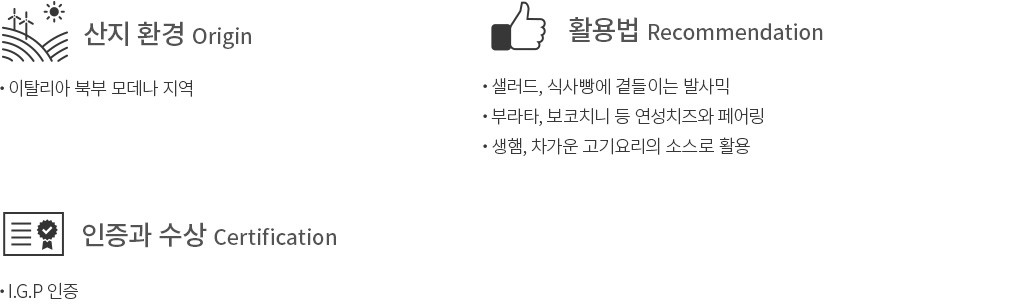 똑같은 향을 더한 발사믹이라도 입안에서 굴려보면 그 깊이감이 조금씩 달라요. 이는 베이스로 사용한 발사믹의 품질에서 오는 차이랍니다. 컬리는 라베키아의 고품질 발사믹을 베이스로 한 제품을 소개할게요. 30년간 나무 배럴에서 숙성해 농밀한 점도와 부드러운 단맛이 인상적인 골든라벨에 무화과 향을 더했어요. 샐러드는 물론이고 치즈, 크래커, 생햄, 빵 등 어떤 재료와 만나도 잘 어울린답니다. 달콤한 풍미가 지배적이니 아이스크림에 살짝 올려도 좋을 거예요.