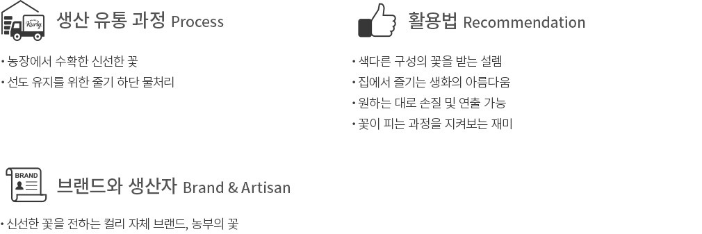 반드시 생수 또는 정수기 물 사용을 권장드립니다.더불어 물의 수위가 높을 경우 줄기가 무를 수 있어 너무 깊지 않은 물에 담가주세요 수령 직후 바로 물에 담가 둘 수 없는 경우, 포장 상태 그대로 어둡고 서늘한 곳에 보관을 권장드립니다. 신선식품 특성상 원물마다 크기 및 형태가 일정하지 않을 수 있습니다.