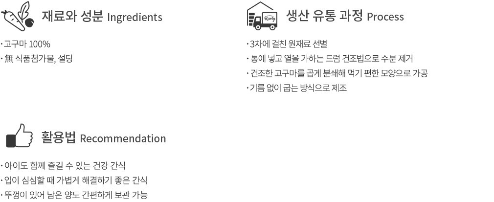 ・특징 : 첨가물과 설탕을 일절 넣지 않고 꿀고구마만으로 만든 제품입니다.