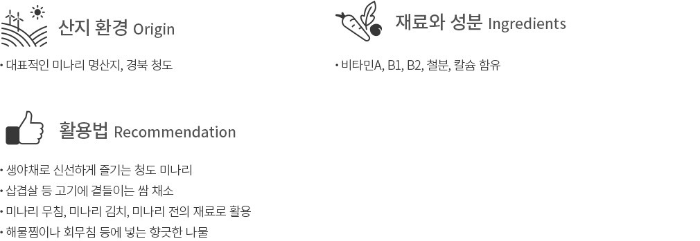 활용팁 ・미나리 무침 : 손질한 미나리를 끓는 물에 살짝 데친 후 찬물에 헹궈주세요. 미나리를 건져 물기를 꼭 짜준 소금을 넣고 버무려주세요. 버무린 미나리를 먹기 좋은 크기로 잘라 참기름이나 깨소금 등을 넣고 조물조물 무쳐서 드세요.