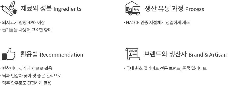 - 돼지고기, 쇠고기, 대두 함유 - 이 제품은 알류, 우유, 메밀, 땅콩, 밀, 고등어, 게, 새우, 복숭아, 토마토, 아황산류, 호두, 닭고기, 오징어, 조개류, 잣을 사용한 제품과 같은 제조시설에서 제조하고 있습니다.
