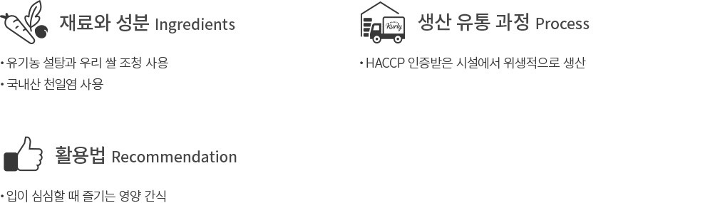・원재료 : 건조 코코넛, 호박씨, 아몬드, 유기농 설탕, 우리 쌀 조청, 메이플 시럽, 국내산 천일염