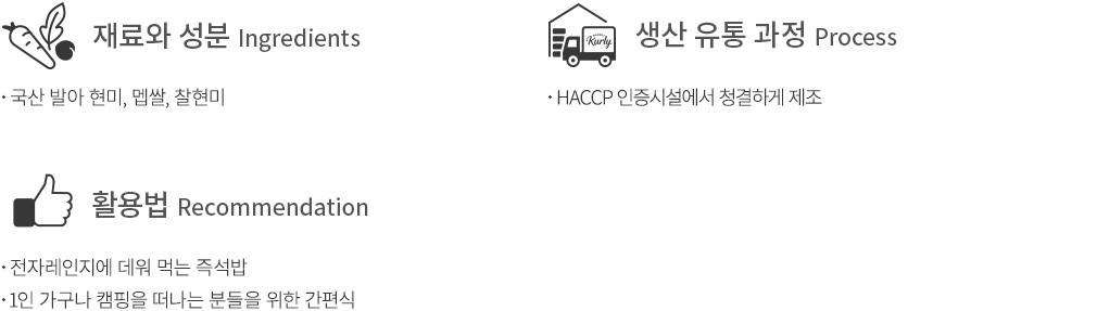 따로 밥을 할 시간은 없지만 따끈하게 김이 올라오는 밥으로 식사하고 싶은 날, 집에 미리 구비해둔 햇반이 참 소중하게 느껴질 거예요. 컬리가 준비한 햇반의 발아 현미밥으로 소중한 끼니를 든든하게 챙겨보세요. 영양 가득한 국산 발아 현미와 멥쌀, 찰현미를 배합해 압력밥솥의 원리로 밥을 지었어요. 현미 특유의 고소한 식감과 고슬고슬함을 고스란히 느낄 수 있답니다. 8개입 묶음으로 준비했으니 찬장에 두고 하나씩 꺼내어 드셔보세요.
