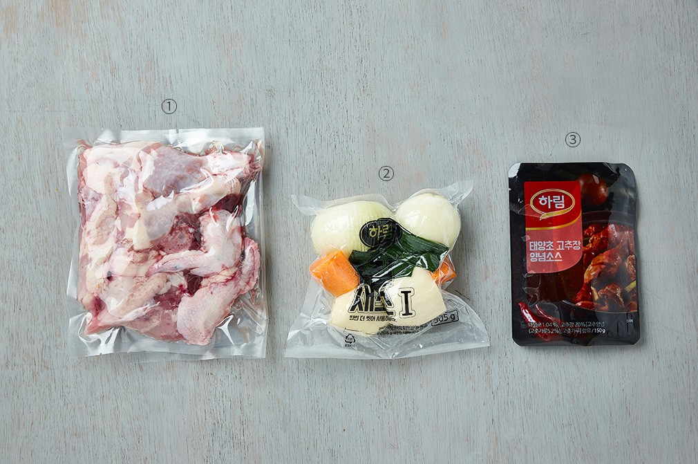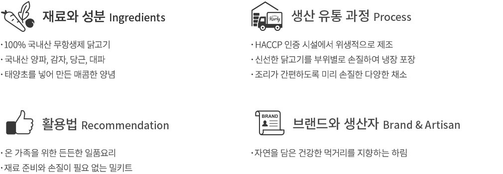 - 닭고기 함유 - 고추장 양념소스 : 대두,밀,우유,쇠고기,토마토 함유 - 본 제품은 알류,우유,메밀,땅콩,대두,밀,고등어,게,새우,돼지고기,복숭아,토마토,호두,쇠고기,오징어,조개류,아황산류,잣을 사용한 제품과 같은 제조시설에서 제조하고 있습니다.