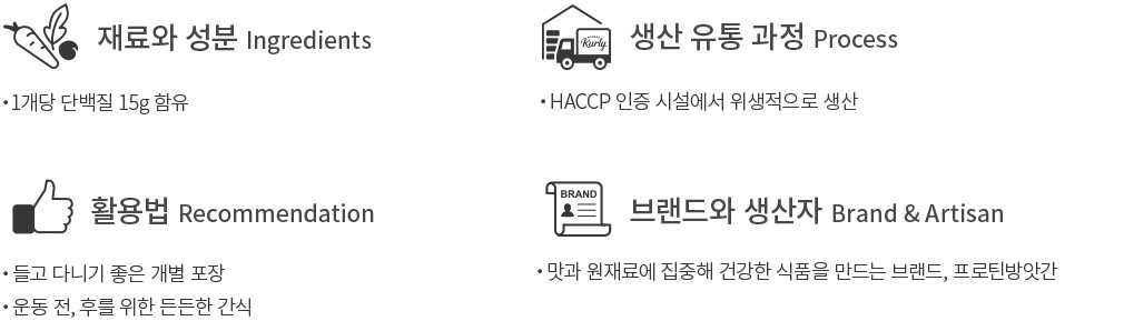 - 대두, 우유, 땅콩 함유 - 호두, 땅콩, 밀, 난류, 메밀, 고등어, 게, 새우, 돼지고기, 복숭아, 토마토, 아황산류, 닭고기, 쇠고기, 오징어, 조개류, 잣 혼입가능
