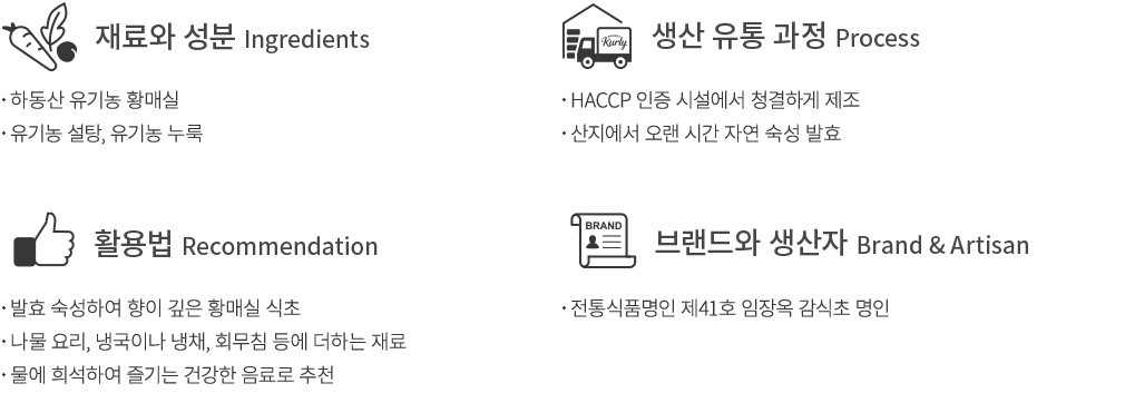 ・테이스팅 노트 : 식초에서 나기 쉬운 특유의 쿰쿰함이나 텁텁함 없이 맑고 깨끗한 느낌이 도드라져요. 회무침에 매실청 대신 사용해도 좋을 만큼 매실의 향이 짙고 산뜻합니다.