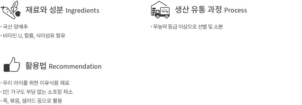우리 아이에게 전하고픈 이유식, 나를 위한 한 끼에 싱싱한 채소가 빠질 수 없어요. 컬리는 활용도 만점인 채소만 골라, 한두 번에 나눠 사용하기 좋은 양으로 담았습니다. 이번에는 맛과 영양, 식감까지 꽉 들어찬 양배추를 준비했어요. 친환경 농법으로 건강하게 길러낸 양배추를 1/4통으로 소분한 뒤 포장했습니다. 남길 걱정 없이 그때그때 신선하게 사용할 수 있을뿐더러, 농약을 사용하지 않고 기른 채소라 더욱 안심이지요. 잎마다 가득 들어찬 수분은 물론, 은은한 달콤함까지 요리에 더해보세요.
