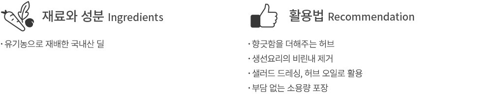 이렇게 활용하세요 딜은 오븐에 굽는 생선요리나 생선에 곁들이는 소스를 만들 때 사용하기 좋은 허브예요.