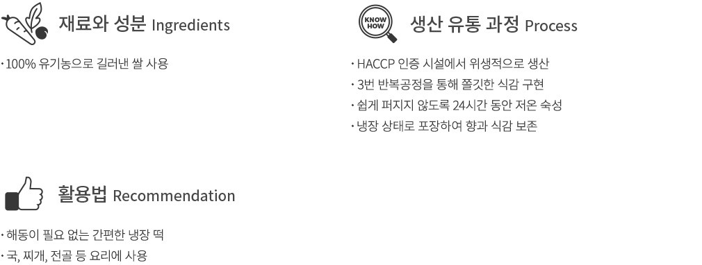 냉장 보관용 떡 특성상 유통기한 내더라도 가정 냉장고 장기 보관시 변질 우려 있으므로 장기 보관시 냉동 보관 권장드립니다.