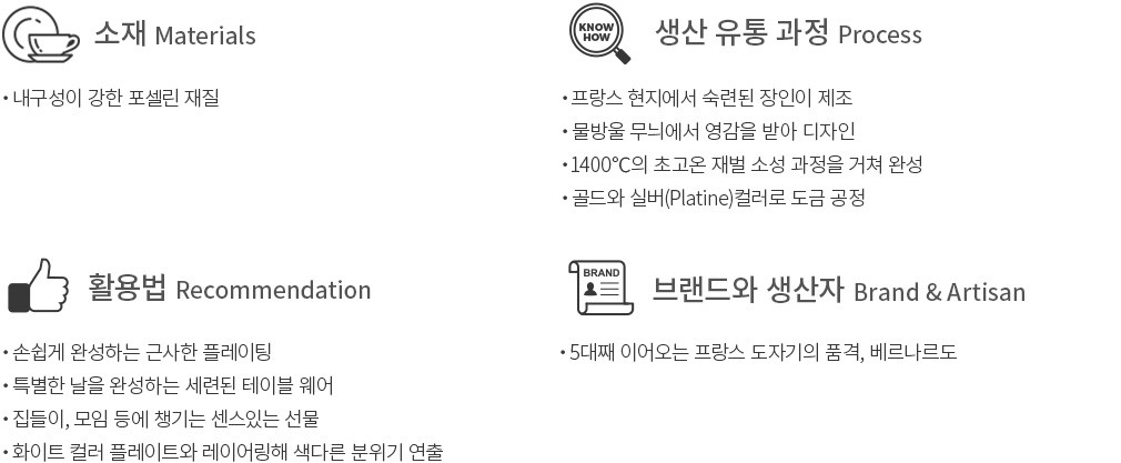 나폴레옹 3세가 집권하던 1863년, 프랑스의 작은 마을 리모쥬에 세워진 도자기 공장이 있습니다. 창립 후 얼마 되지 않아 왕실의 테이블 웨어로 채택될 만큼, 일찍이 그 품질을 인정받은 곳이지요. 5대째 가업으로 굳건히 이어져 오고 있는 명품 도자기 브랜드, 베르나르도는 이렇게 시작되었습니다. 양질의 고령토를 사용해, 숙련된 장인의 손길로 피워낸 도자기는 테이블 웨어를 넘어 '작품'으로 까지 불리고 있어요. 프랑스 대통령 관저와 각국 왕실은 물론, 전 세계의 내로라하는 식당의 사랑을 한 몸에 받는 도자기이기도 하지요. 명성에 걸맞는 견고함과 아름다움이 깃든 베르나르도의 작품을 지금 컬리에서 만나보세요.