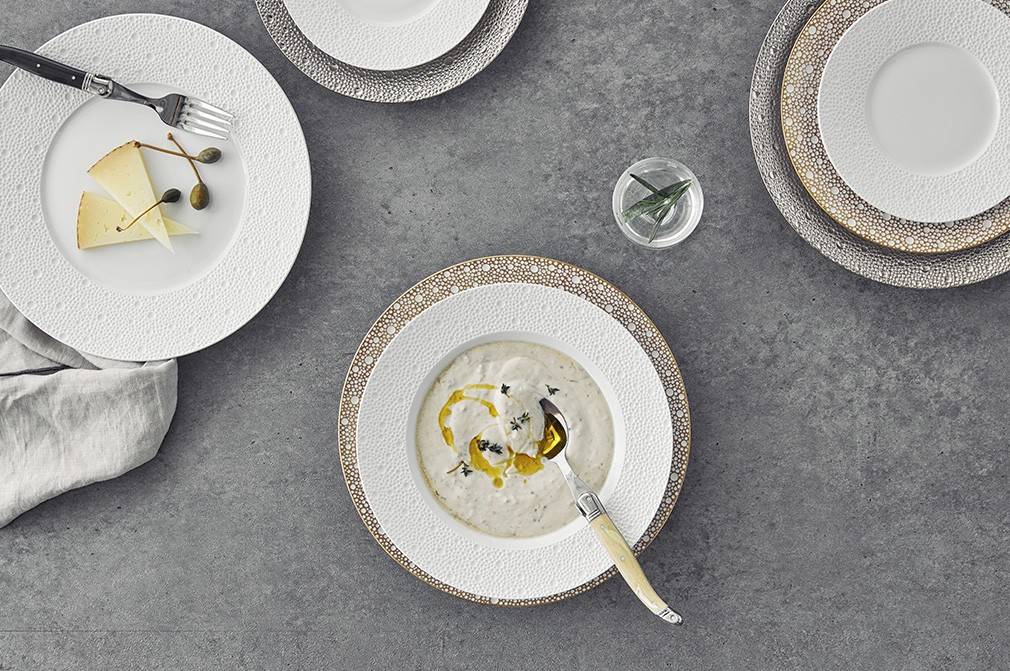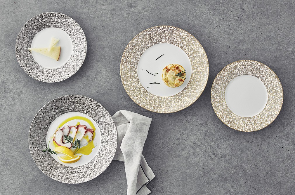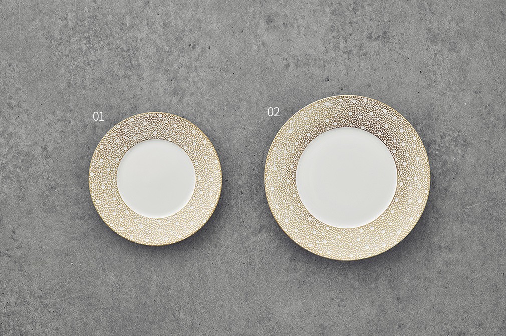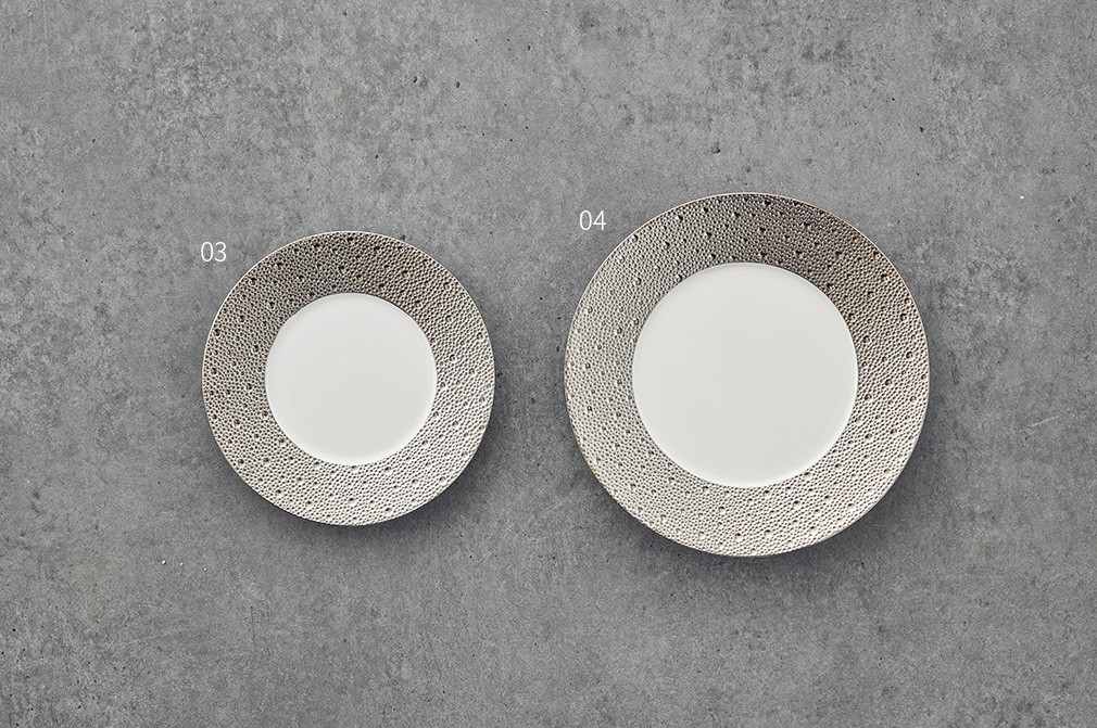 감각적인 식탁을 완성해 줄 특별한 테이블 웨어를 소개할게요. 전 세계 미슐랭 식당과 특급호텔이 사랑하는 브랜드, 베르나르도가 선보이는 에퀴메 컬러 플레이트입니다. '에퀴메'라는 이름은 '거품'을 뜻하는 프랑스어에서 왔어요. 파도가 지나간 해안가의 모습을 순백의 플레이트 위 골드와 실버 컬러의 물방울무늬로 담아냈지요. 화이트 컬러의 세라믹과 금과 은으로 장식된 섬세한 음각 무늬의 조합은 요리가 한층 돋보일 수 있도록 도와줍니다. 화이트 컬러의 플레이트와 레이어링해서 연출하면 무늬의 색감이 조화롭게 어울리면서 그 화려함이 배가 되니 다양하게 조합해 색다른 아름다움을 완성해 보세요.