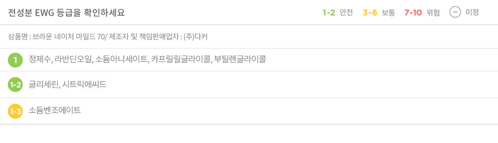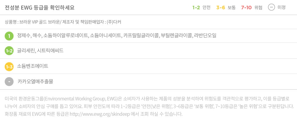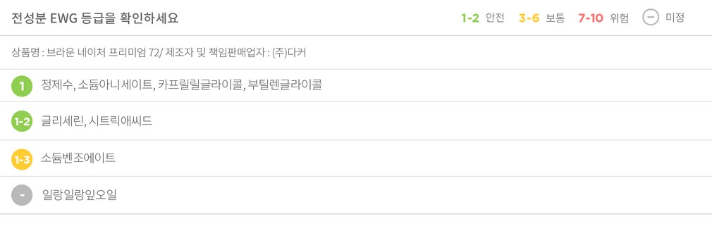 컬리는 EWG로부터 보통, 위험 등급을 받은 성분이라 하더라도 숨기지 않고 정직하게 공개합니다. 더불어 우려되는 성분에 대한 정보를 함께 제공해 드리오니 구입 전 반드시 확인해 주세요.