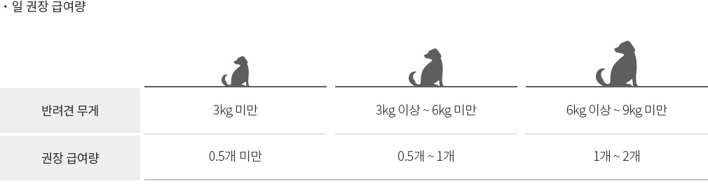 간식 급여 시 주의사항 ・반려견의 연령, 종의 특성, 활동량에 따라 급여량을 조절해주세요.