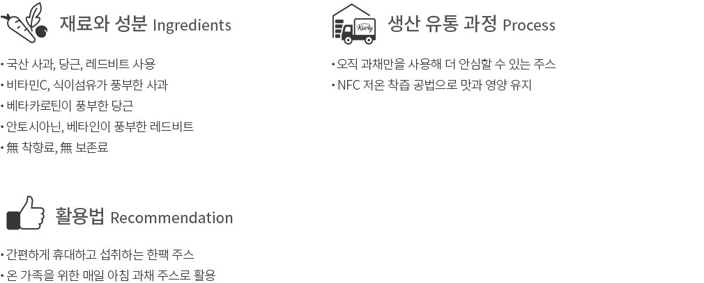 ・특징 : 국산 사과, 당근 그리고 레드비트를 껍질 채 착즙해 담은 주스예요. 첨가물 없이 오직 과채만을 사용했기에 더욱 안심하고 즐길 수 있지요.
