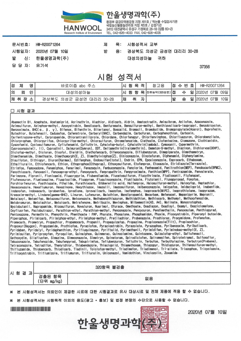 성적서를 확인하세요 ・바로이즙의 ABC 착즙주스는 (주)한울생명과학의 시험을 통해 잔류 농약 320개 성분에 대하여 불검출 되었음을 확인했으니 안심하고 섭취하세요.