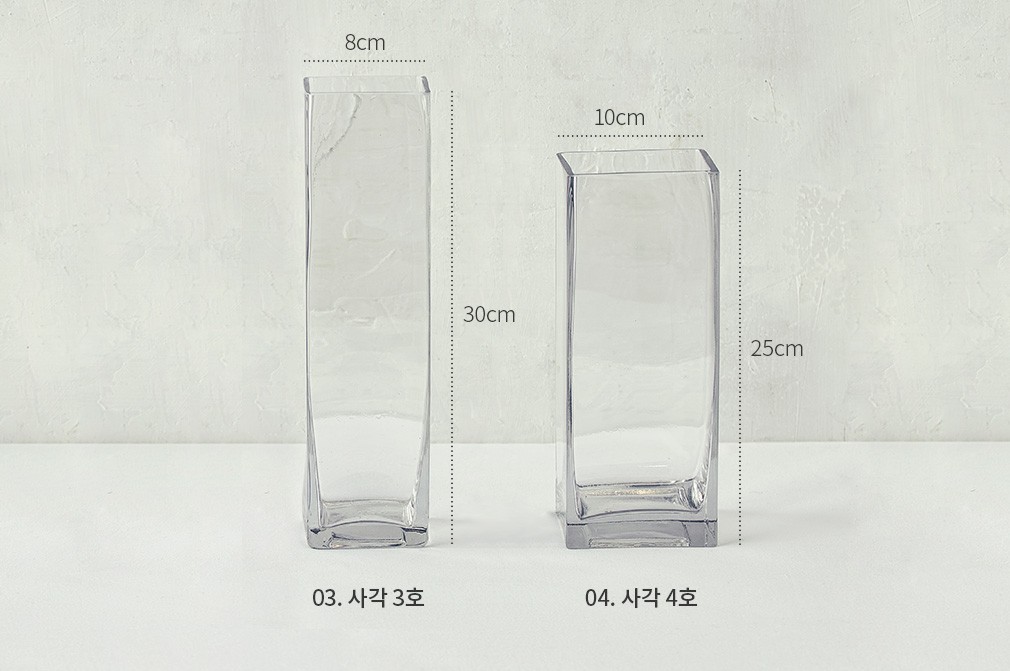 ・특징 : 사각 1호보다 몸체가 살짝 긴 화병이에요. 줄기가 긴 꽃, 가지가 풍성한 그린 소재들을 꽂아 두기 좋아요.