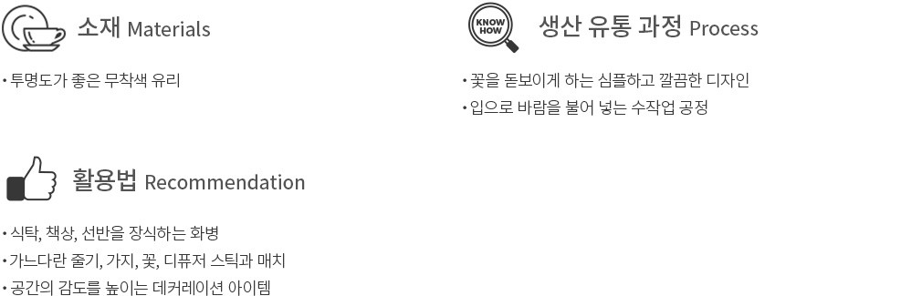 ・특징 : 정사각형 모양의 입구와 깔끔한 직선이 돋보이는 화병이에요. 줄기가 가늘고 곧은 식물과 매치했을 때 더욱 빛을 발한답니다.
