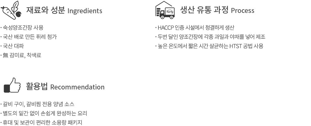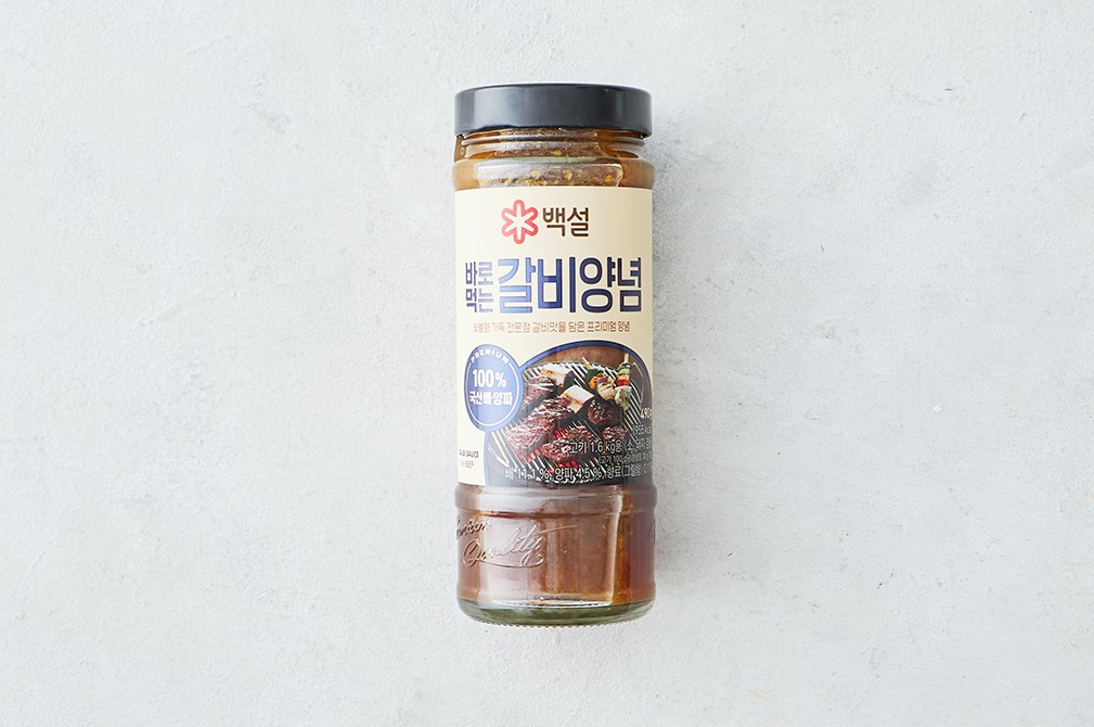 짭조름한 갈비는 양념에 따라 그 맛이 좌우되는데요. 백설의 갈비 양념 한 통만 있으면, 이제 집에서도 전문점의 갈비 맛을 손쉽게 누릴 수 있답니다. 오랜 시간 숙성한 양조간장을 사용해 양념 맛에서 깊이감이 느껴져요. 국산 배로 만든 퓌레를 첨가하여 자극적이지 않은 단맛을 만들어냈고요. 다양한 국산 채소가 어우러져 감칠맛이 자연스레 쏙쏙 배어있답니다. 고기에 따로 밑간을 하지 않아도 되니 이보다 간편할 수 없어요. 외식하러 나가기 번거로울 때, 갈비 양념 한 통을 요긴하게 활용해보세요.