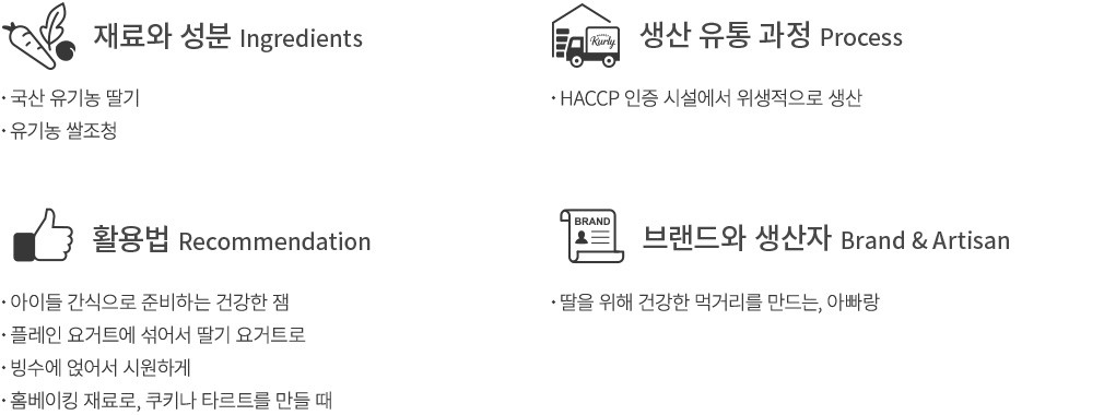 아빠의 마음으로 재료와 성분을 꼼꼼히 따져 만드는 식품 브랜드, 아빠랑의 유기농 딸기잼을 소개합니다. 설탕을 넣지 않고 만든 조청으로 단맛을 냈어요. 국산 유기농 딸기와 유기농 쌀조청으로 만들었기 때문에 더욱더 안심하고 아이에게 먹일 수 있어요. 단맛이 슴슴하게 느껴지는 편이지만, 대신 딸기 본연의 맛이 진하게 퍼진답니다. 샌드위치나 요거트에 듬뿍 얹어줘도 좋아요.