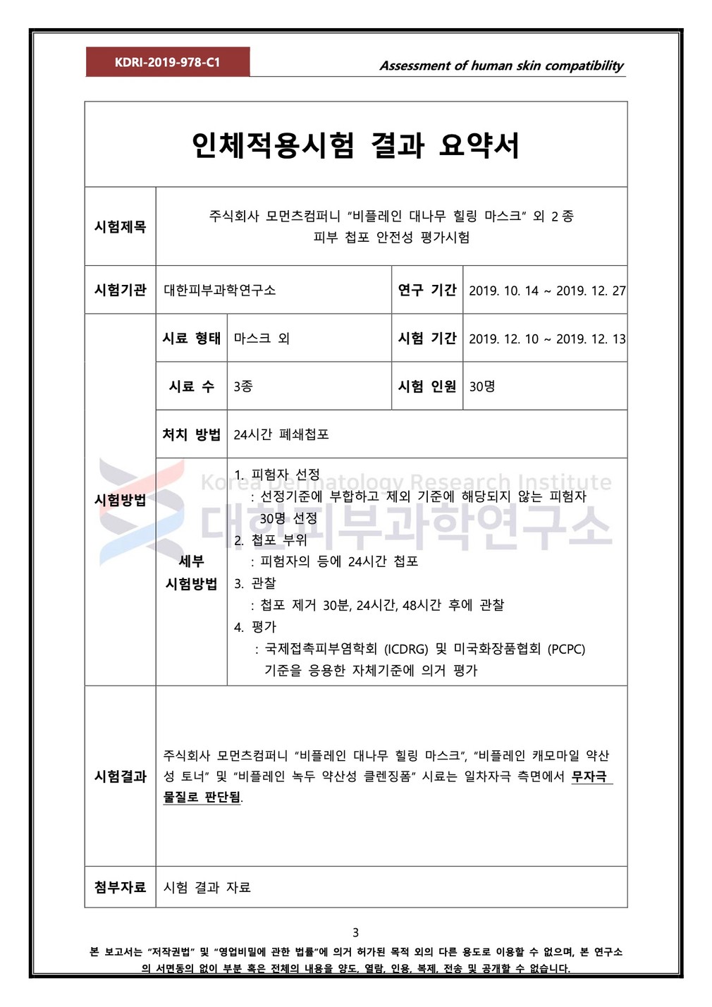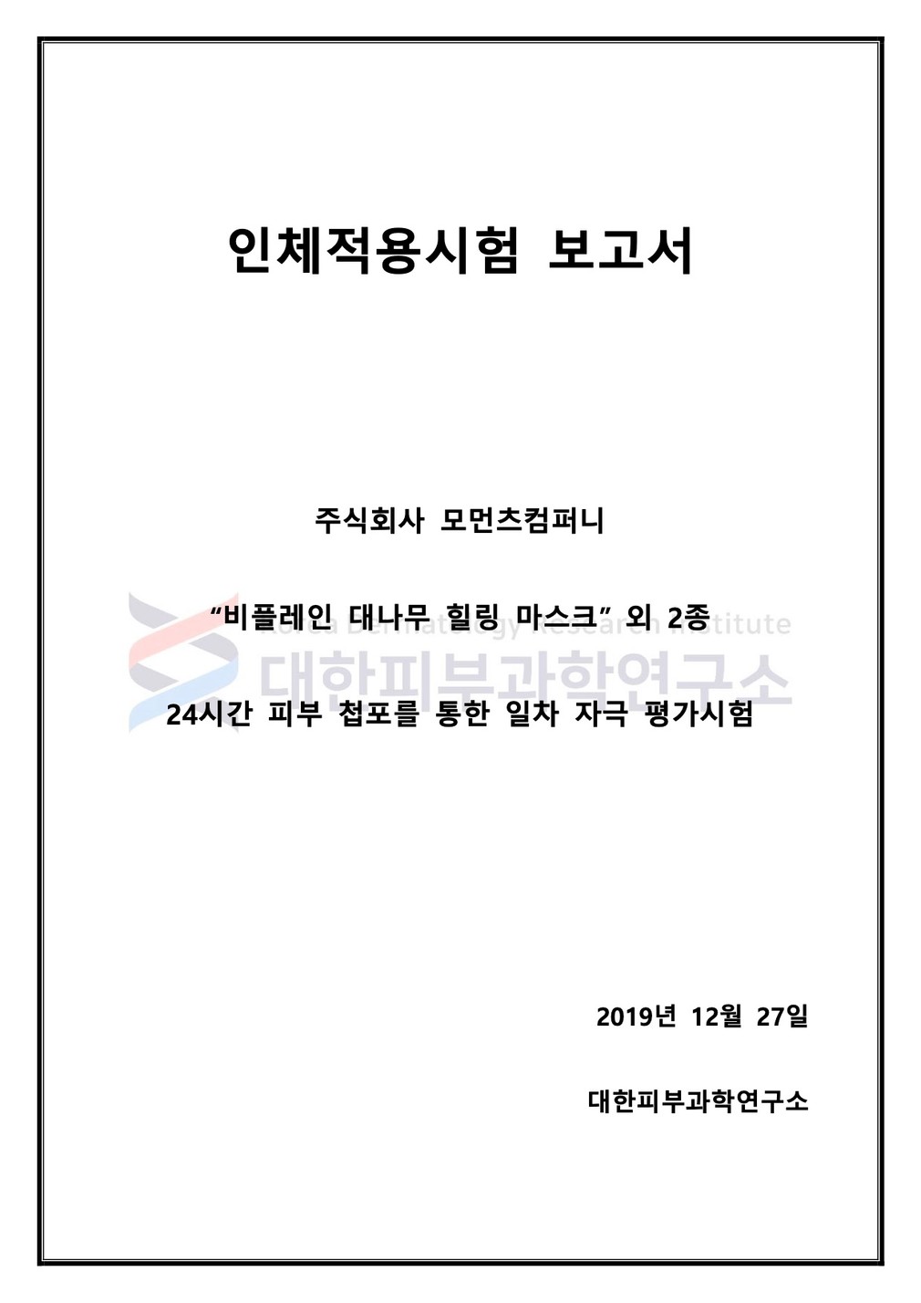 성적서를 확인하세요 ・'비플레인 캐모마일 약산성 토너'는 대한피부과학연구소의 피부 첩포 안정성 평가시험 결과, 피부 일차 자극에 대해 무자극 물질로 판정되었어요.