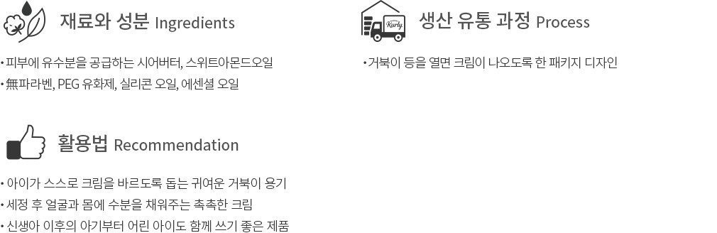 ・사용법 : 세안, 목욕 후 아이의 얼굴과 전신에 부드럽게 발라 흡수시키세요. 건조할 때마다 발라줘도 좋아요.