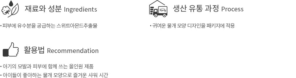 ・사용법 : 물기 있는 손이나 부드러운 샤워볼에 적당량을 덜어 아기의 머리와 피부를 부드럽게 마사지한 후 씻어냅니다.