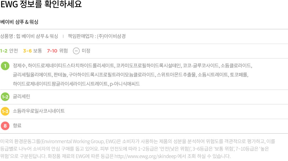 컬리는 EWG로부터 보통, 위험 등급을 받은 성분이라 하더라도 숨기지 않고 정직하게 공개합니다. 더불어 우려되는 성분에 대한 정보를 함께 제공해 드리오니 구입 전 반드시 확인해 주세요.