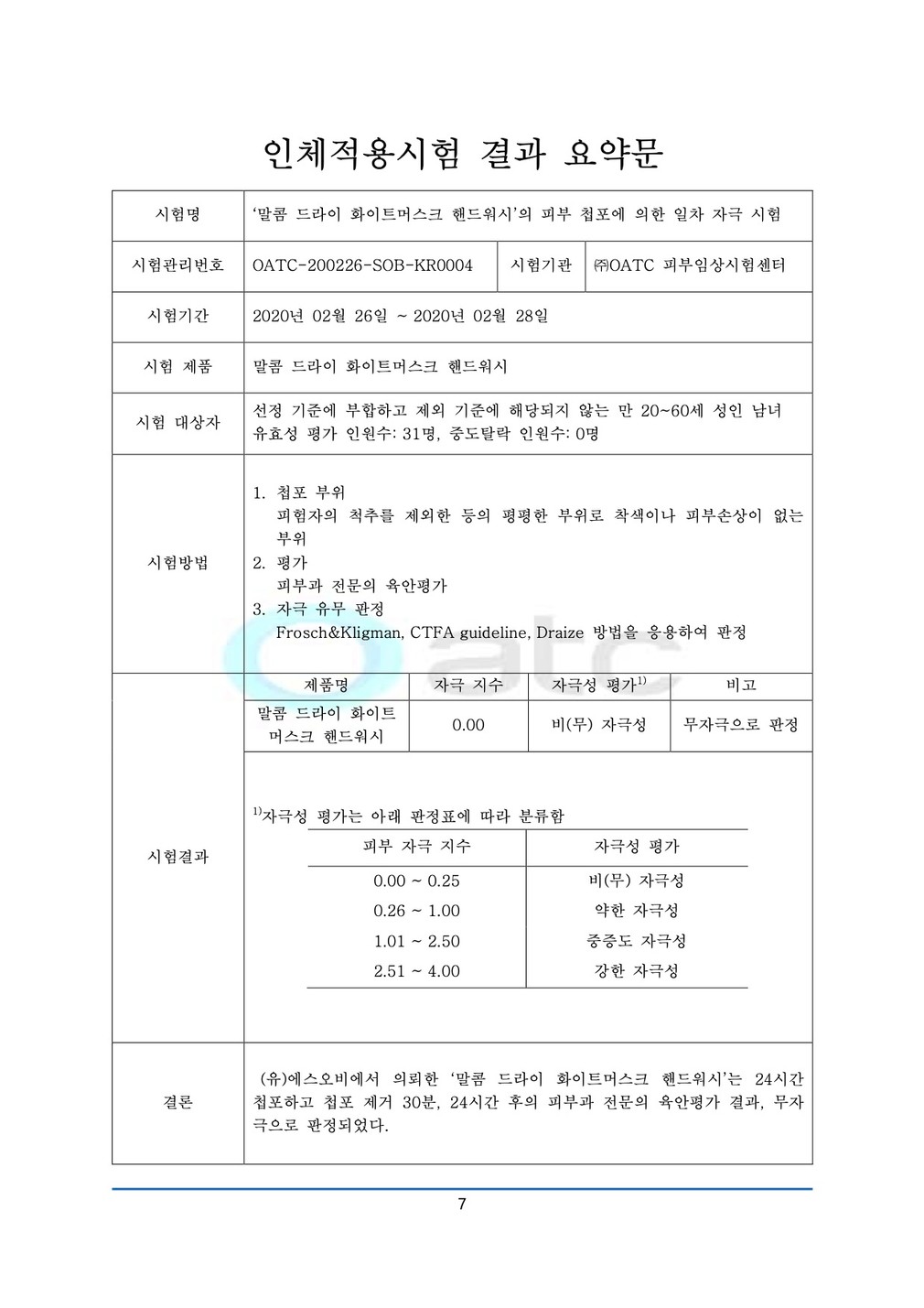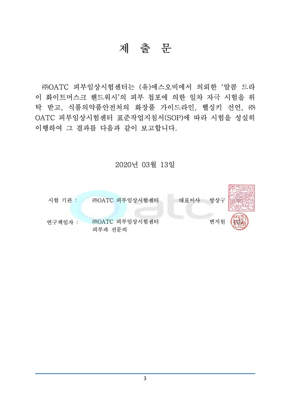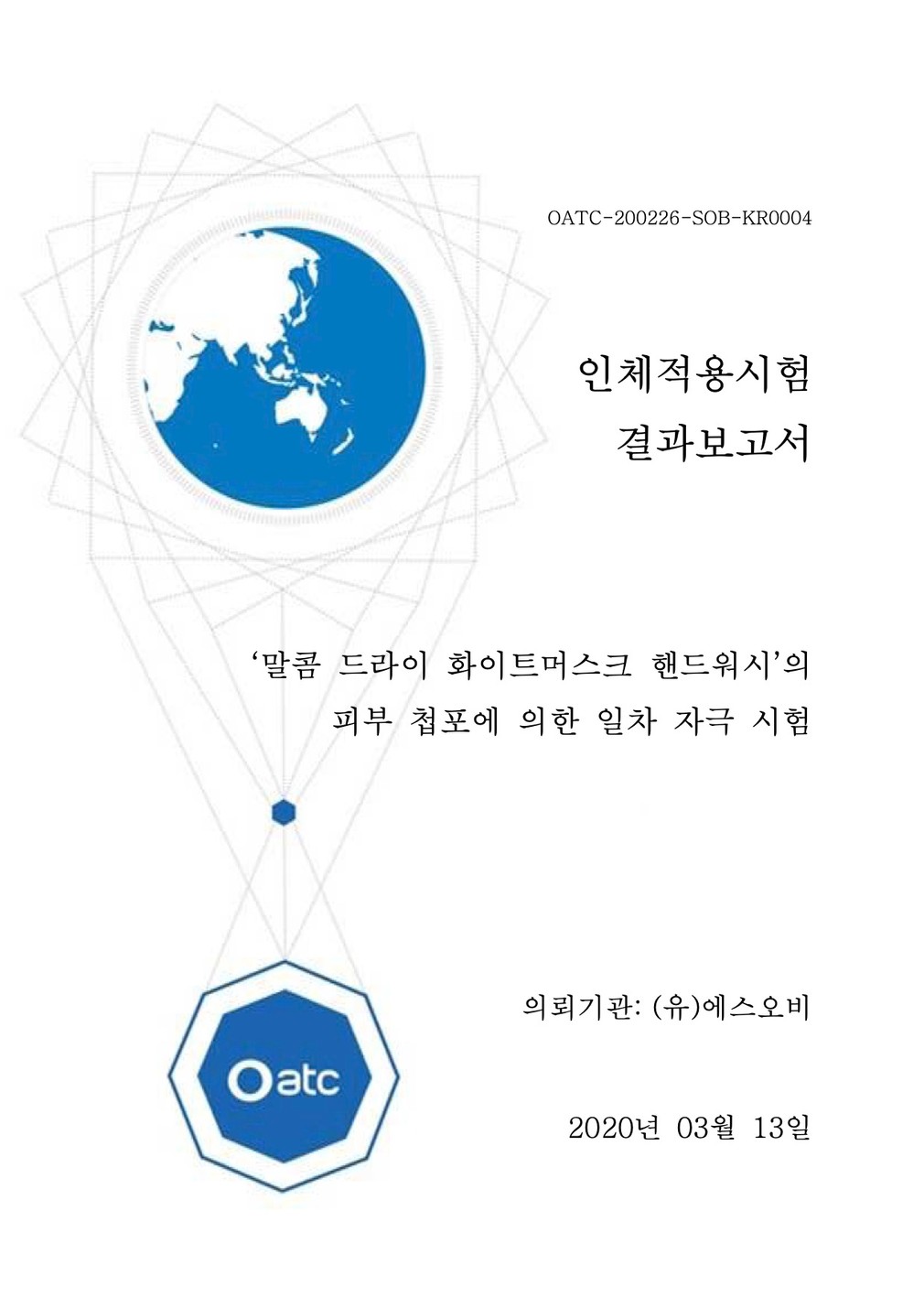 성적서를 확인하세요 ・말콤의 어트랙티브 보타닉 핸드워시는 (주)OATC피부임상시험센터의 24시간 피부 첩포에 의한 일차 자극 시험 결과 비(무)자극 물질로 판정되었어요.