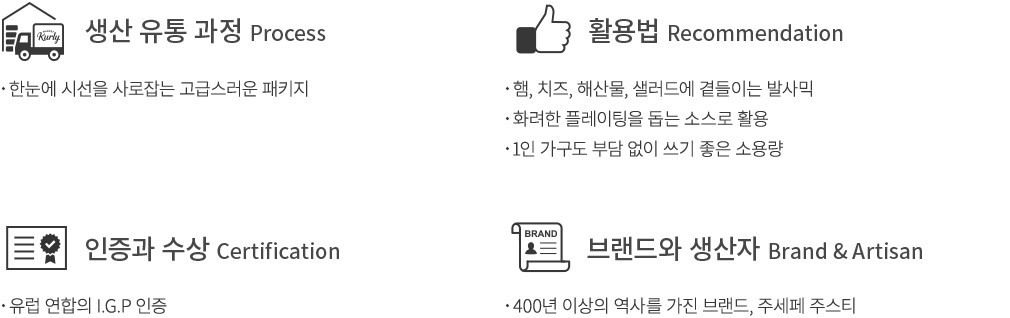 400년이 넘는 전통을 지닌 발사믹 식초 브랜드, 주세페주스티의 노하우가 집약된 발사믹 식초를 소개합니다. 이탈리아의 모데나 지역에서 재배한 포도를 건조하고 원액을 추출한 다음, 나무 배럴에서 숙성시켰어요. 배럴을 엄격하게 관리하기에 숙성 과정에서 향과 맛, 풍미가 농축되어 훌륭한 발사믹이 완성됩니다. 특히 산뜻한 풍미와 은은한 단맛이 조화롭게 어우러져 더욱 매력적이죠. 햄과 치즈, 해산물, 샐러드에 곁들여 즐겨 보세요.