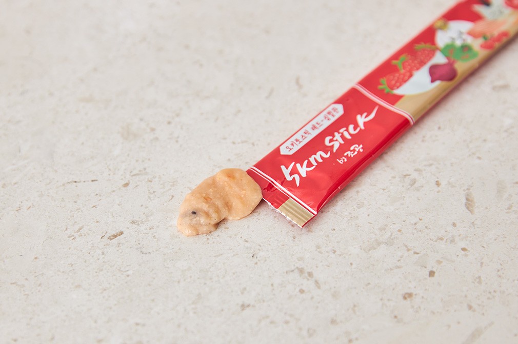 간식의 질감을 확인하세요 ・수분 함량이 높아 점도가 낮고 액체에 가까운 촉촉한 질감이에요. 일반적인 스틱형 간식보다 꽤 묽은 편입니다.