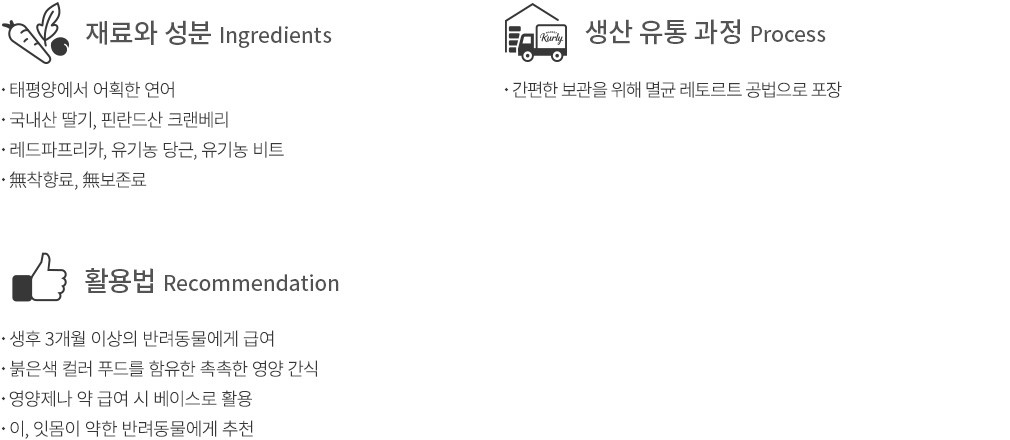 ・원재료 : 연어, 타피오카(전분), 딸기(국내산), 정제수, 당근(제주산), 레드파프리카(국내산), 크랜베리(핀란드산), 비트(국내산), 천연색소