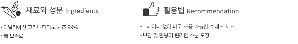 ・특징 : 이탈리아의 숙성 치즈인 그라나파다노를 슈레드 형태로 갈아서 포장한 제품이에요. 별도의 치즈 그레이터가 필요 없어 활용하기 간편하답니다.