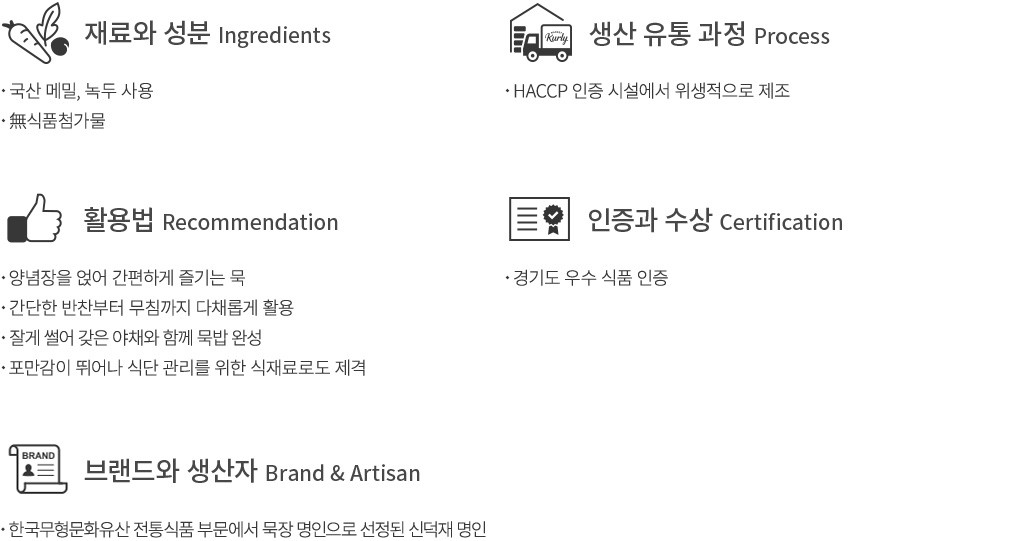 냉장 보관 및 가급적 빠른 섭취를 권장드립니다. 섭취 전 묵을 데친 후, 충분히 찬물에 식혀 드시면 탱글한 묵의 식감을 즐길 수 있습니다.